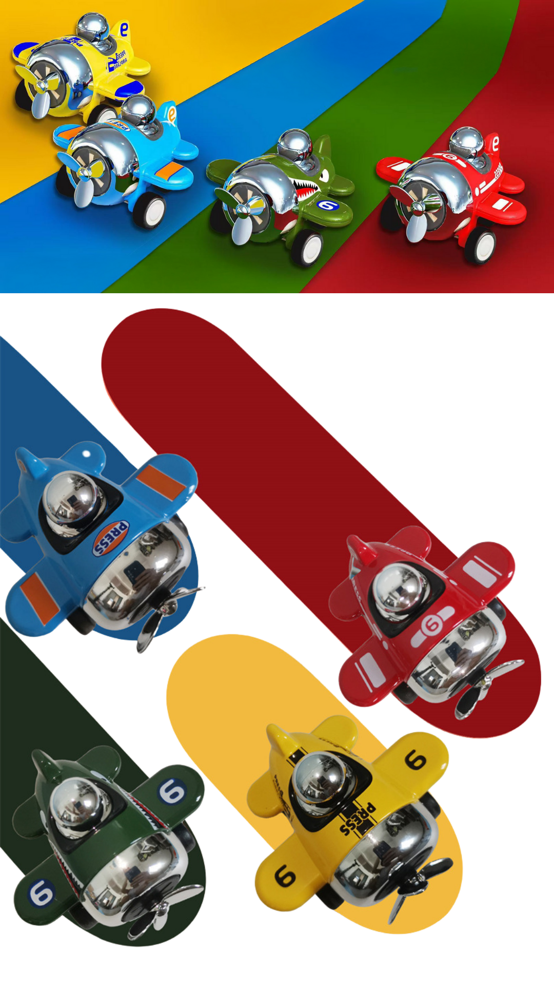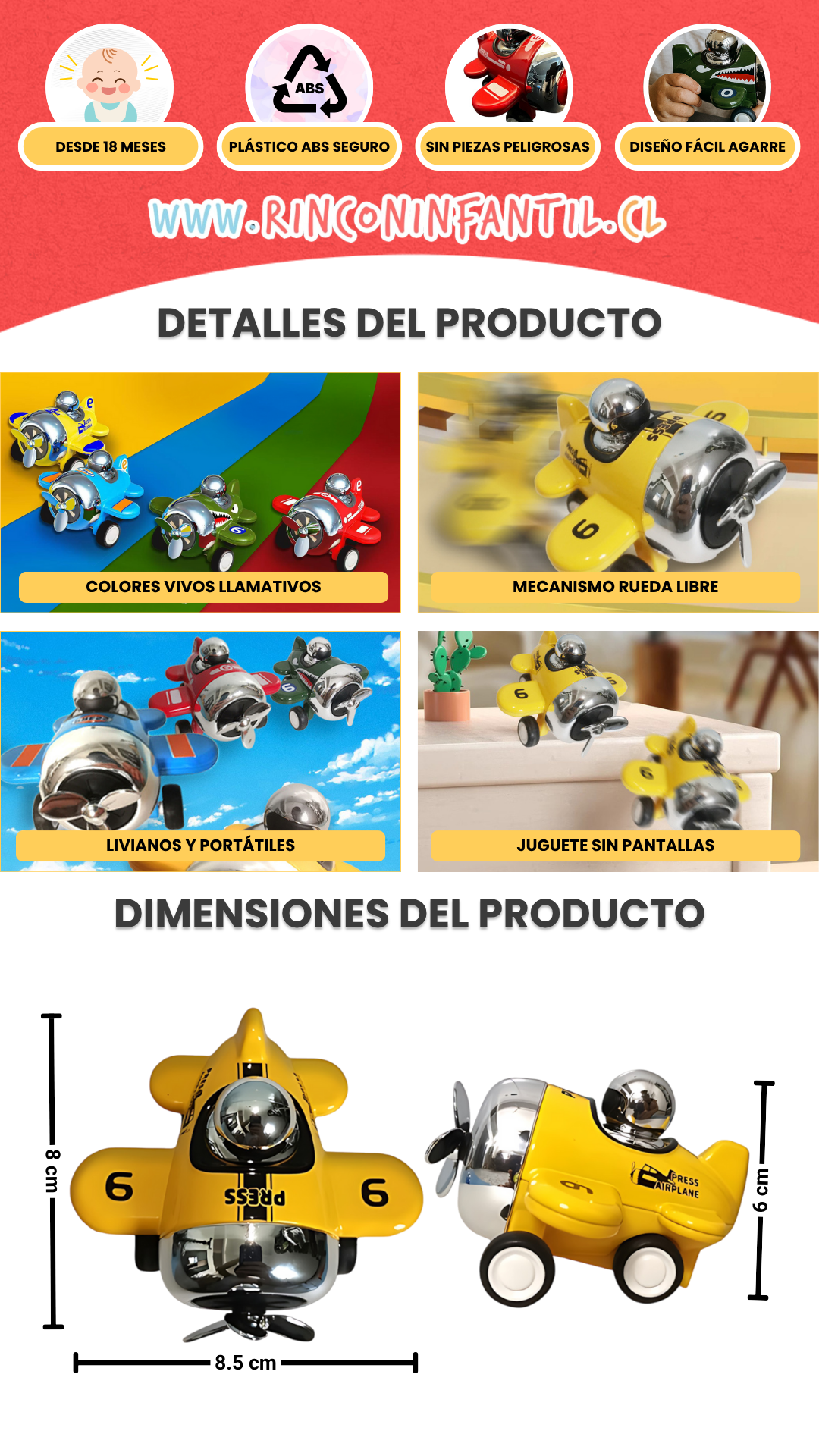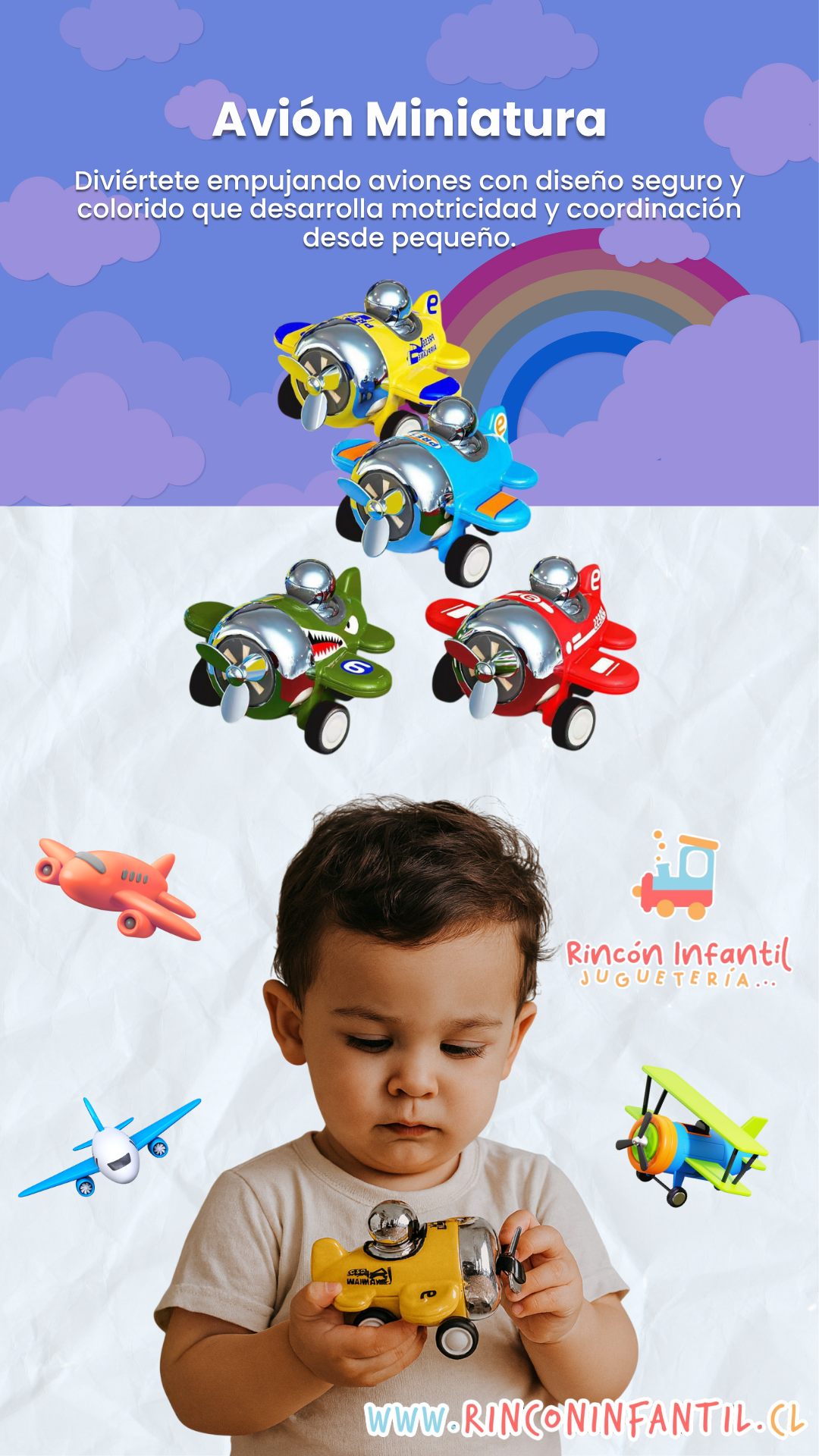 ¡A toda velocidad por la imaginación! Este mini avión de empuje es perfecto para niños desde los 18 meses. Su diseño compacto, seguro y colorido estimula la motricidad fina, el juego libre y la coordinación ojo-mano, mientras los pequeños lo empujan por todas partes.
