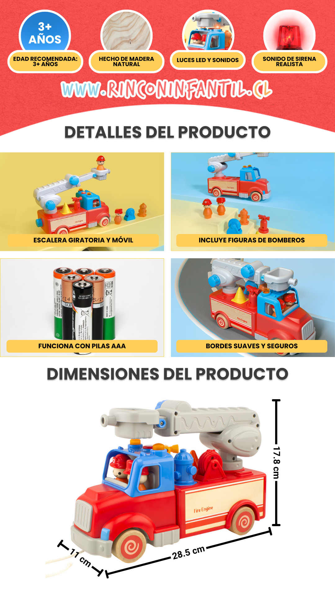 Este espectacular camión de bomberos de madera está diseñado para ofrecer horas de juego imaginativo y educativo. Confeccionado con madera de alta calidad y plástico ABS no tóxico, incorpora luces, sonidos realistas, escalera giratoria de 360° y múltiples accesorios para una experiencia de juego completa.