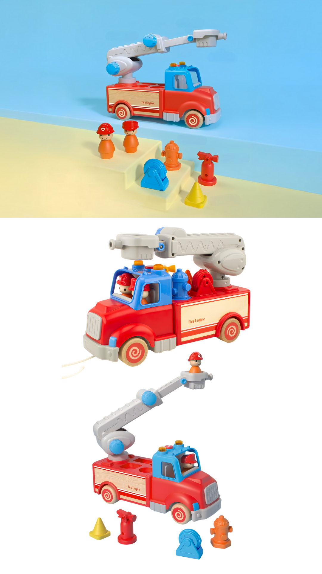 Camión de bomberos de madera con luces, sonidos y escalera funcional. Incluye 2 figuras, accesorios y cuerda para arrastre. Estimula la imaginación, la coordinación y el juego simbólico. Ideal desde los 18 meses.