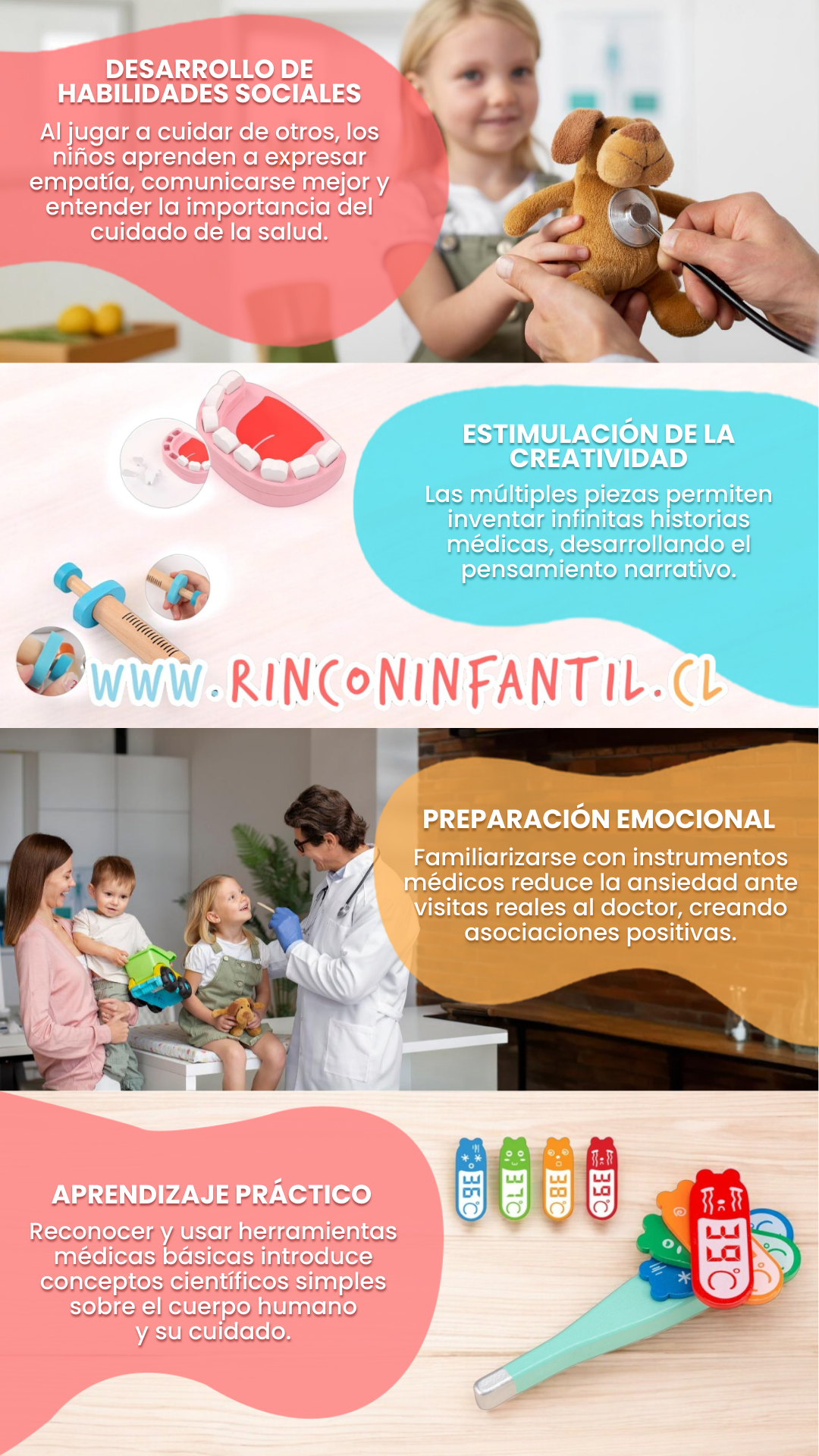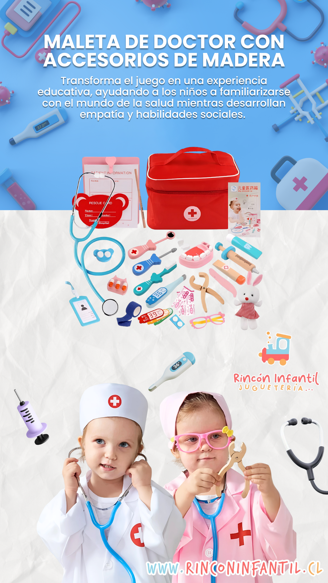El Set de Doctor de Madera es una excelente opción para desarrollar la creatividad, fortalecer el vínculo emocional y enseñar cuidado hacia los demás. Ideal para jugar en casa o en el jardín infantil, y perfecto como regalo educativo para cumpleaños o Navidad.