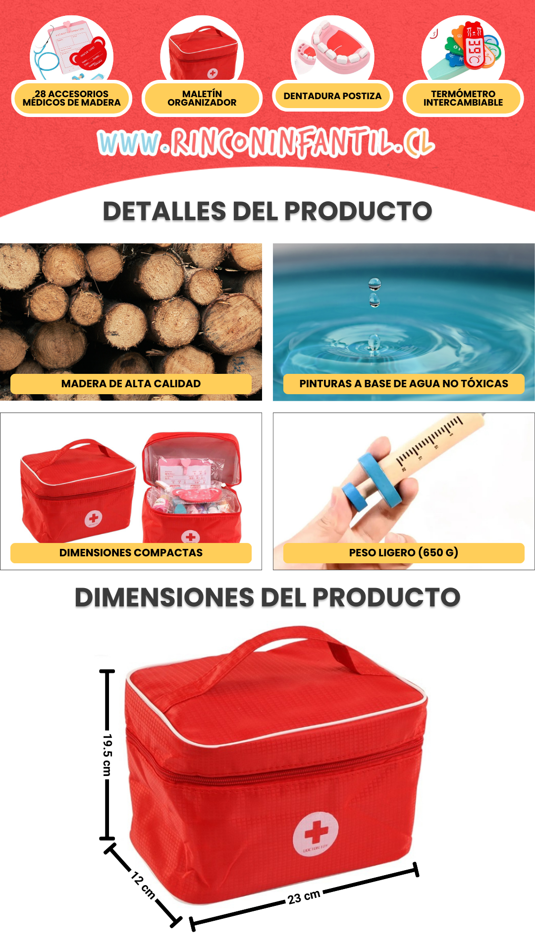 | Incluye | Estetoscopio, termómetro, cápsulas, jeringa, dentadura, pinzas y más |