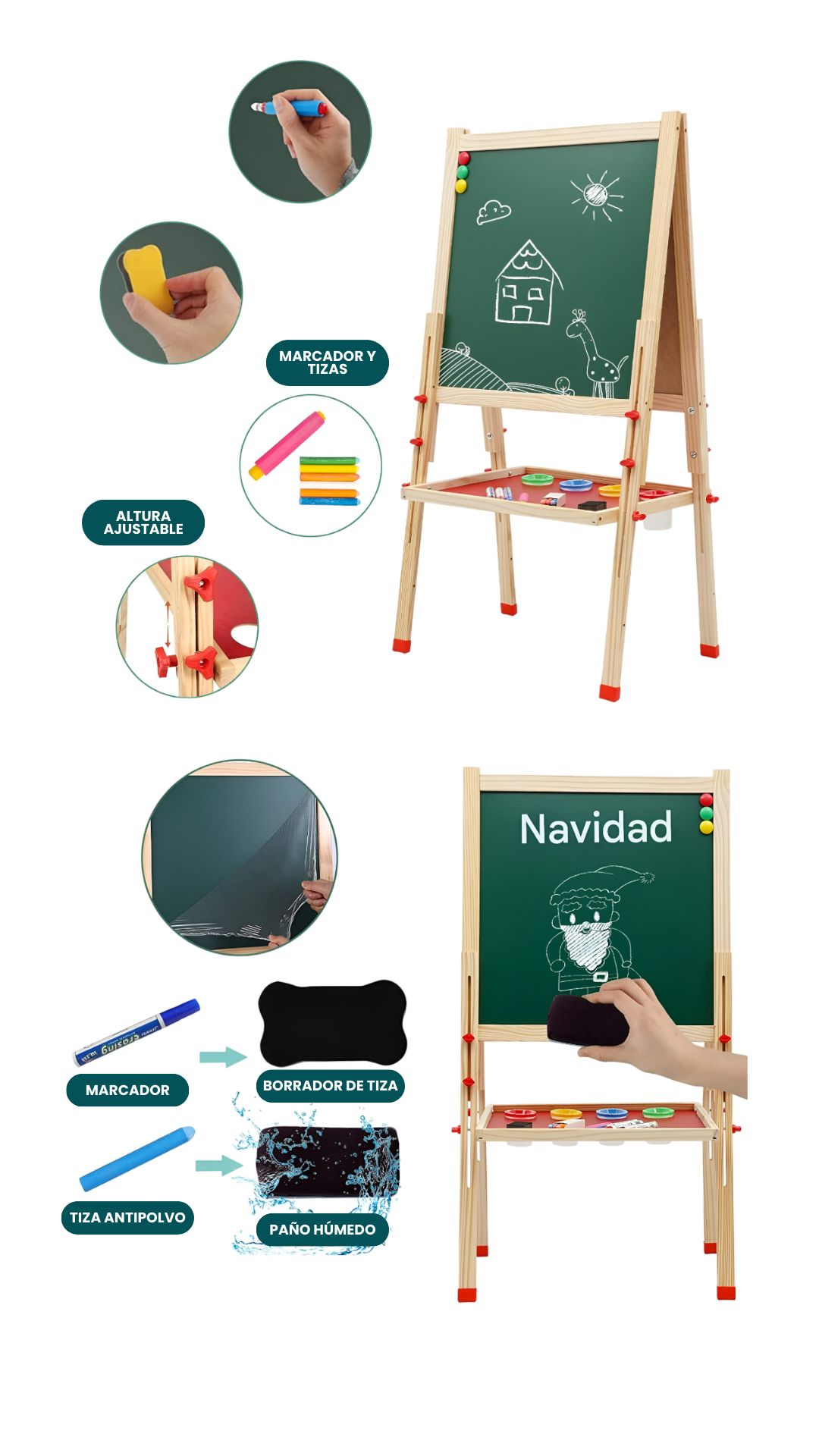 La pizarra incluye un set de tizas, plumón y borrador para empezar a crear obras de arte al instante. ¡Recomendada para niños de 3 a 8 años! Confeccionada con materiales de madera de alta calidad para garantizar su durabilidad. La pizarra es una excelente opción para fomentar el arte y el aprendizaje en casa o en el jardín infantil