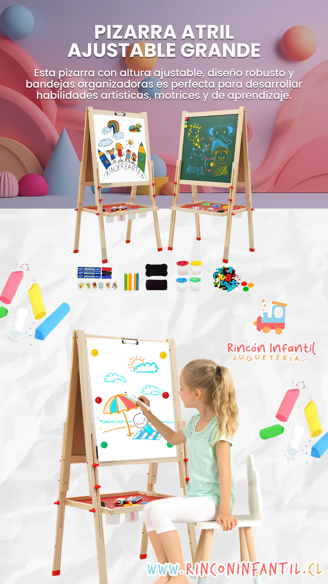 La Pizarra Atril Ajustable Grande es una herramienta educativa ideal para el desarrollo creativo y cognitivo de los niños. Gracias a su altura regulable, múltiples superficies y accesorios incluidos, ofrece una experiencia completa para pintar, escribir y jugar.