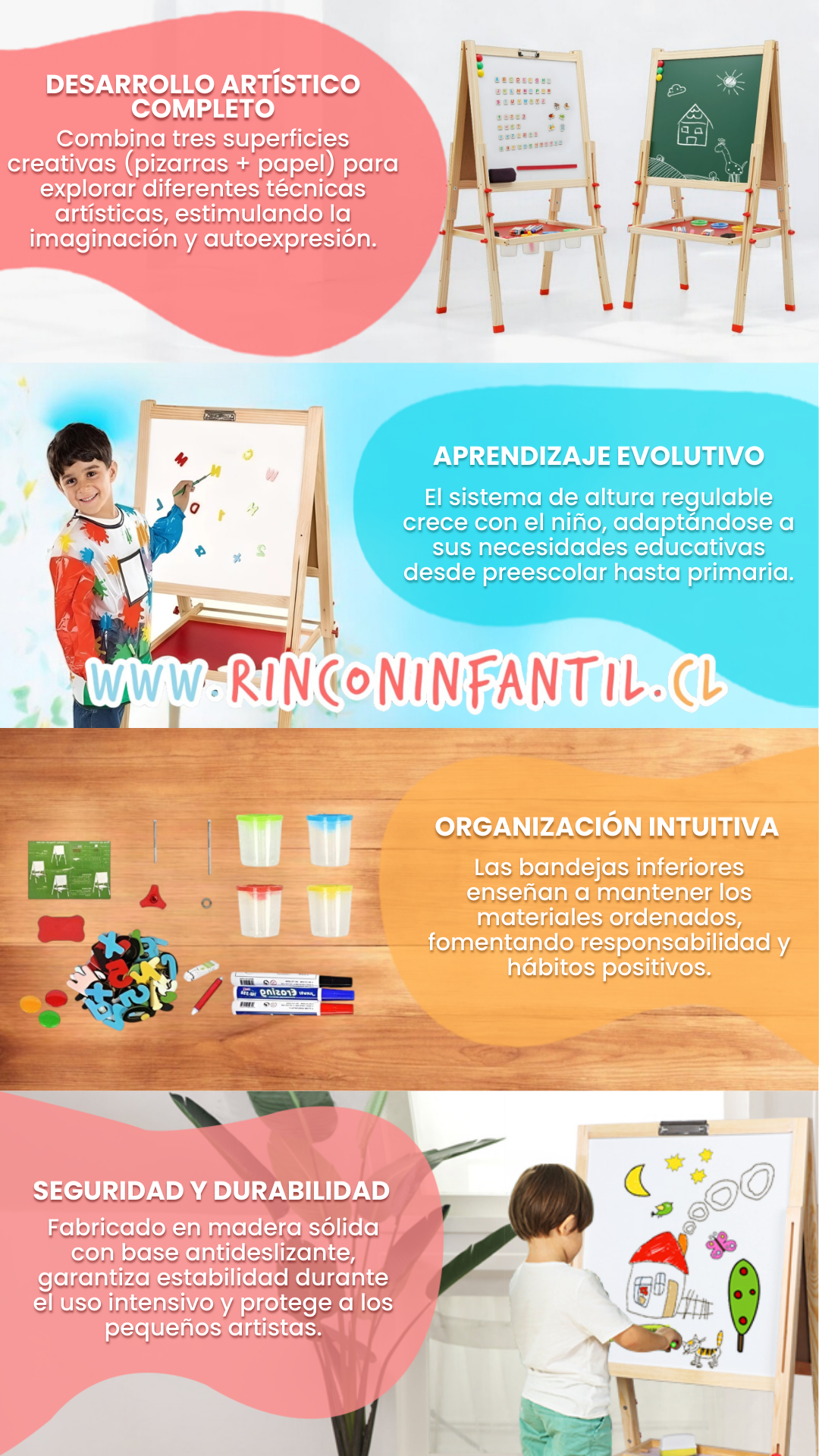 La Pizarra Atril Ajustable Grande es la elección perfecta para quienes buscan estimular el desarrollo integral de los niños mediante actividades educativas y artísticas en casa o en entornos escolares.
