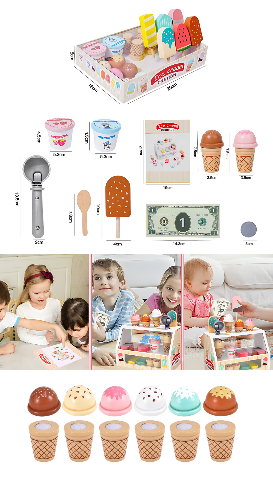¡Una heladería en tus manos! Este set de madera invita a niños y niñas a jugar a vender helados, estimulando la imaginación, la motricidad y el aprendizaje con diversión asegurada. Ideal para juegos de rol desde los 3 años.